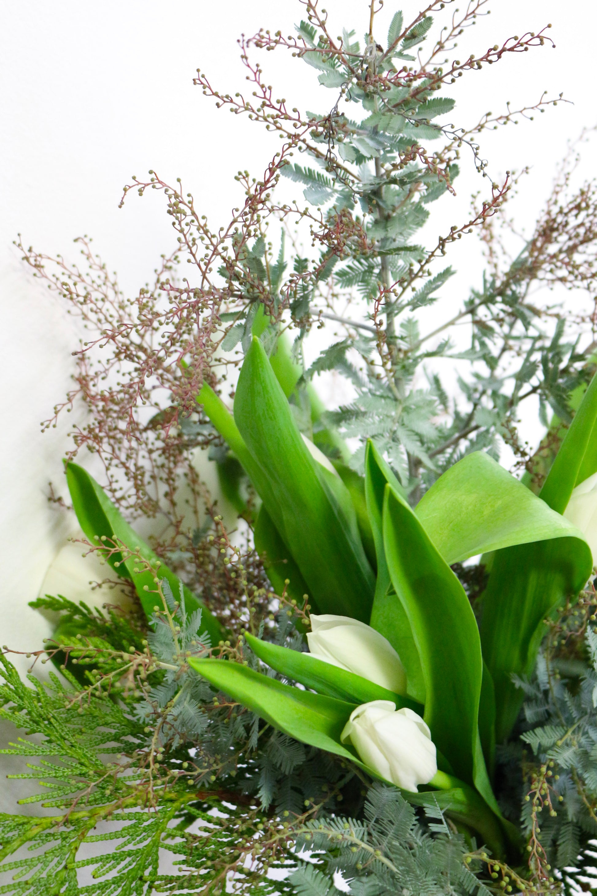 Les tulipes douces, suaves et lumineuses, jouent les premières notes, tandis que l’acacia délicat improvise en arrière-plan, comme une mélodie feutrée qui flotte dans l’air. Chaque fleur est placée comme une touche d’ivoire sur un clavier : avec précision, douceur et émotion.